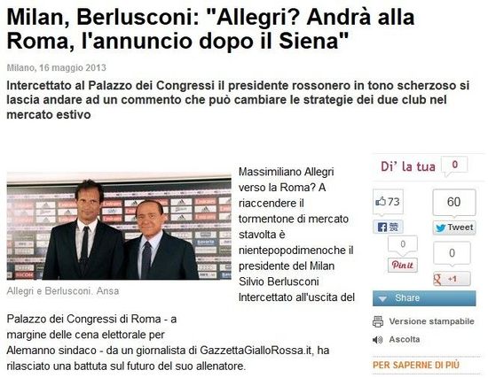 贝卢斯科尼的表态让人意外。的确,罗马正在寻找主帅,并和阿莱格里传出绯闻。在意大利影响力颇大的《晚邮报》甚至在5月4日爆料,阿莱格里已经和罗马签约3年。不过,这条消息迅速被米兰、罗马和阿莱格里本人否认。《Resport》5月14日报道,阿莱格里在踢完同罗马的比赛后和萨巴蒂尼接洽,米兰官网再次否认。这和贝总现在的表态相去甚远。