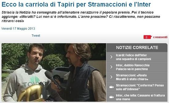 本赛季国米在意甲联赛成绩不佳,目前排名第九位的他们已经确定无缘下赛季的欧战,这是蓝黑军团14年来首次缺席欧洲赛场。当地时间本周五,国米主帅斯特拉马乔尼又被颁发了金貘奖。金貘奖是意大利国家电视台所制作的一个搞笑、讽刺、批判现实之类的奖项,一般颁发给近期最失意最倒霉的人。
