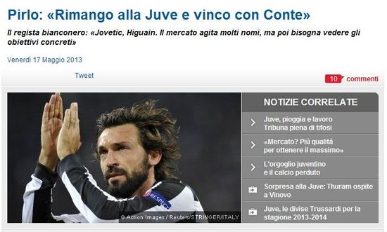 采访一开始,皮尔洛就第一时间否认了与皇马的传闻:“我听说了这个故事,球迷没必要担心,因为这个消息毫无根据,同孔蒂一样,我肯定会留在都灵城。安切洛蒂固然是个伟大的教练,我和他关系好的很,经常联络,无需隐瞒,但斑马军团才是我现实的选择,我只想身披黑白间条衫赢得更多荣誉。”