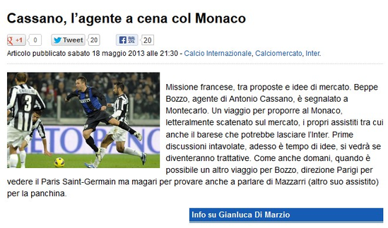 卡萨诺今夏离开国际米兰的可能性越来越大。5月19日,《意大利天空体育台》转会专家迪马尔齐奥通过网站透露,卡萨诺的经纪人佩普-波佐前往蒙特卡洛,和摩纳哥进行了接触。