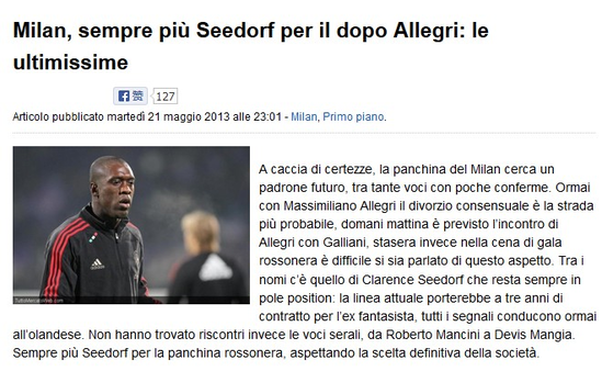 阿莱格里尽管率领米兰拿到了欧冠参赛资格,但他离开圣西罗球场的可能性越来越大。迪马尔齐奥透露,西多夫将会接替阿莱格里入主米兰,荷兰人有望得到一份为期3年的合同。