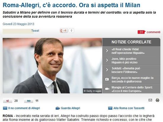 来自意大利媒体《罗马体育报》的消息称,罗马俱乐部体育总监沃尔特-萨巴蒂尼当地时间昨天亲赴米兰城,在晚间约见了阿莱格里,双方已经就合同的相关细节再度进行了磋商,并且最终达成一致。阿莱格里将从罗马得到一份为期3年的合同,而年薪略低于执教米兰时期,但也接近300万欧元(来自《Mediaset》的消息称为280万欧元)。