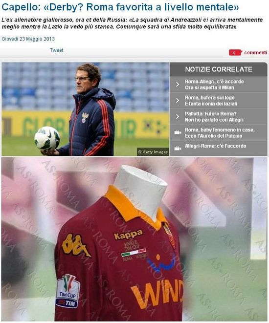 曾率罗马夺得过意甲冠军的名帅卡佩罗看好自己的旧主,“罗马目前的精神面貌更好,上周末他们战胜了那不勒斯,这将给球队带来积极的作用。当然,德比是一场特殊的比赛,不能根据纸面实力做出预测。我们必须让球员们明白,这是一场德比战,是一场特殊的比赛,必须竭尽全力。更难得的是,这还是意大利杯决赛。”而曾在罗马效力多年的蒙特拉则表示,“我曾经历过很多次罗马德比,我希望罗马城两队的球迷们都能在比赛中保持冷静,这应该是属于足球的美好一天。”
