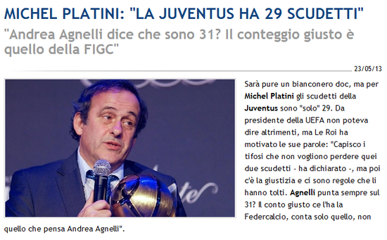尤文图斯刚刚在意甲卫冕成功,尽管意大利足协认定这是斑马军团的第29座意甲奖杯,但俱乐部官方却坚称自己的奖杯数量是31座。欧足联主席也给出了自己的态度,他支持足协的决定。“这是个敏感的话题,但尤文的意甲冠军数量是29个。我明白尤文的球迷们不希望自己的两个冠军被剥夺,但正义和规则也无法抹煞。”普拉蒂尼说。“阿涅利也坚持称31个?只有足协的统计才是唯一正确的,不是阿涅利怎么说就怎么算。那两年的冠军归属是符合证据和规则的,足协有权做出最终裁决。尤文为过去的事付出了代价,但他们很快也会赢得第30和31个冠军。”