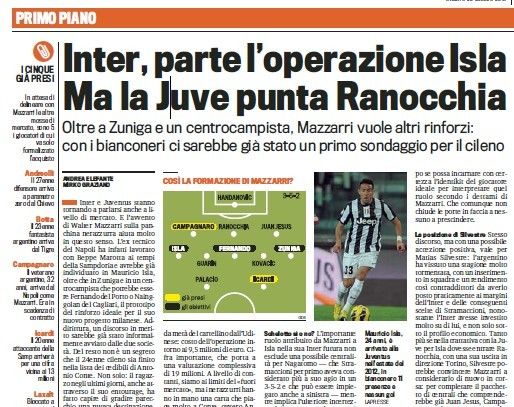 马扎里曾和马罗塔在桑普多利亚有过共事经历,两人都很欣赏伊斯拉。去年夏天,尤文图斯950万欧元收购伊斯拉的共有权。这意味着,智利人的身价达到1900万欧元。然而,因为伤病和战术因素,伊斯拉并未发挥关键作用。《米兰体育报》报道,伊斯拉已经上了尤文图斯的出售名单,球员经纪人也表达了转会的想法。现在的问题是,尤文图斯去年收购伊斯拉付出了不菲的代价。不过,国际米兰手中也有孔蒂器重的球员拉诺基亚。对两家俱乐部来说,伊斯拉拉诺基亚互换东家,是个不错的选择。这需要尤文图斯先买断伊斯拉。