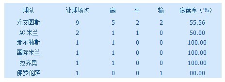 球队方面,尤文图斯在让球场次中占了9场,战绩为5胜2平2负,赢盘率为56%。不过在这9场比赛中居然有6场上半场和对手打成0:0,这是其他强队所没有的。AC米兰有2场让球,战绩为1胜1平。那不勒斯、佛罗伦萨、国际米兰和拉齐奥也各有1场让球。