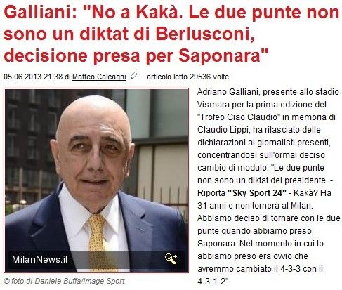 在安切洛蒂的4312战术体系中,卡卡是关键球员。冬歇期,为了收购卡卡,加利亚尼可谓竭尽所能,可惜最后因为税务问题功亏一篑。《罗马体育报》报道,米兰今夏有意再次求购卡卡,这笔交易得到了贝卢斯科尼主席的钦点。在阿尔克雷别墅进行的会谈中,米兰今夏收购卡卡,这是俱乐部高层的重点议题。让人意外的是,加利亚尼迅速予以否认。“卡卡今夏不会回归米兰。首先,卡卡已经31岁。而且,卡卡的年薪也达到了1000万欧元。”
