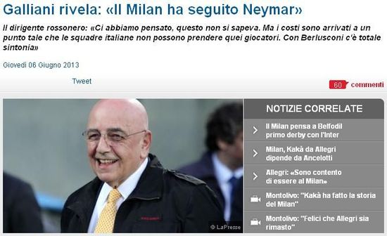 接下来米兰的主要工作就是夏季转会。近来欧洲足坛最震撼的转会就是内马尔以5700万欧元加盟巴萨,对此加总透露,“事实上米兰俱乐部一直在关注考察内马尔,只是没有人知道而已。但引进他的成本太高了,不可能有哪家意大利俱乐部能够承担得起,巴萨俱乐部的预算是我们的两倍。”