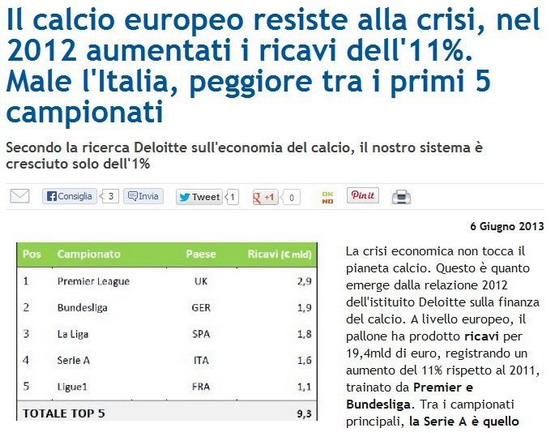 意大利近几年糟糕的经济状况影响了意甲俱乐部的竞争力。德勤会计师事务所公布了欧洲足坛2012年各大联赛的经济情况,意甲形势不容乐观。《Mediaset》援引这家机构的统计数据报道:在欧洲主流联赛中,意甲收入增加速度最慢,但球员薪水占总收入比例最高。