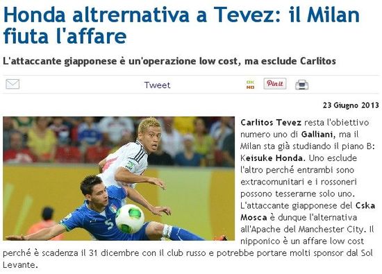 “失去特维斯不代表世界末日”,《mediaset》不忘安慰加利亚尼。在这家媒体看来,尤文很有可能在7天内杀死特维斯悬念,马罗塔即将开启的英伦之行,已迫使图拉蒂总部放弃收购阿根廷人的念头。但帕齐尼长期缺阵的情况下,米兰引进攻击手的现实需求没有改变,加总何去何从?没钱有没钱的活法,本田圭佑就是理想替代方案。