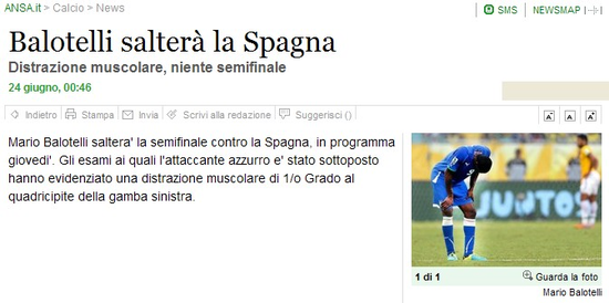 当地时间周日晚间,意大利国家队主管队医恩里科-卡斯特拉齐向媒体透露,由于在对阵巴西的小组赛拉伤右大腿肌肉,巴洛特利无法在短时间内恢复,将肯定缺席半决赛与西班牙队的较量,队医将对他的伤情进行逐日观察,以确定他是否能够赶得上意大利接下来的比赛(决赛或者季军争夺战)。