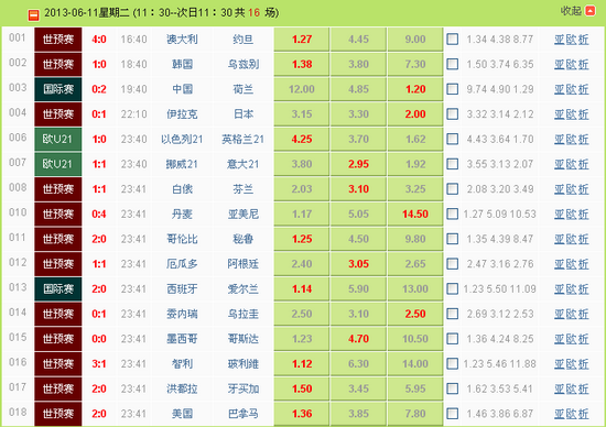 2013年06月12日 01:10 来源:竞彩足球昨日共有16场比赛开售,主要由世界杯预选赛和友谊赛构成。中国国家队在工人体育场0比2负于世界亚军荷兰队;西班牙2比0战胜爱尔兰;伊拉克0比1负于日本无缘世界杯;阿根廷在厄瓜多尔的高原主场1比1拿走1分,当然最大的冷门非丹麦0比4负于亚美尼亚莫属(打出固定奖金14.50)。