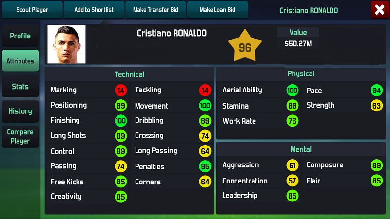 在足球经理2020手游中,C罗评份96,非常写实的评分系统,能够给经理人们带来沉浸式的体验。